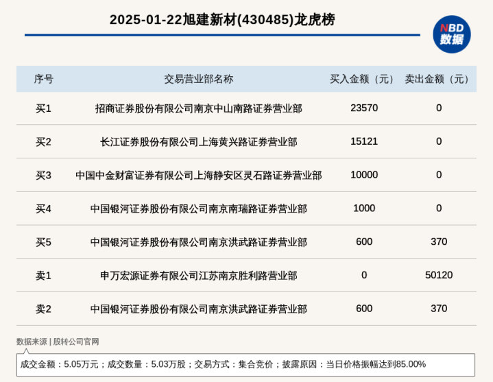 每经讯,2025年1月22日,新三板基础层公司旭建新材(430485,收盘价:1.2元)登上龙虎榜,交易方式是集合竞价,披露原因是当日价格振幅达到85.00%,成交数量5.03万股,成交金额5.05万元。买一席位为招商证券股份有限公司南京中山南路证券营业部,买入2.36万元;卖一席位为申万宏源证券有限公司江苏南京胜利路营业部,卖出5.01万元。